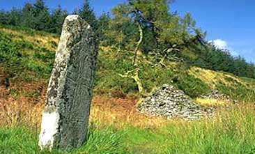 This simple stone with carvings on both sides (the one seen here is the E face) is positioned just beside a (holy?) well. One of the ruins of the later settlement of Kilmory Oib can be seen in the distance. We cannot be certain about the meaning of the name 'Kilmory'. Depending on the stress pattern of the original pronunciation, it could mean 'Church of Mary' or 'Church of Saint Maelrubha'.