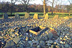 Temple Wood has produced charcoal remains which have been dated to before 3,000 BC. Here stood a circle of timber posts which was later replaced by a stone circle. Later another circle just to the south-west was built around 3,000 BC. Many centuries later burials were added to the site, in cists. Finally both circles were 'smothered' in stone cobbles, cairn material. What was the purpose of that? To attract attention to the two circles, to make them more grand and imposing? Or perhaps to cover them up and to suffocate their power?