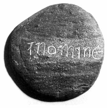 The words on the disk mean 'In the Name' - and can be assumed to reflect Christian devotion, being a shortened form of In Nomine Domini or In Nomine Dei, respectively 'In the Lord's name' or 'In God's name'. Or perhaps In Nomine Summi Dei, 'In the name of God the most high', an expression familiar from Hiberno-Latin writing.